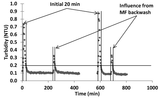 Performance monitoring of the BAC utilised on-line turbidity measurements of the BAC effluent. Turbidity values should be low and increases in turbidity may be indicative of changes in biological activity. A high turbidity (>0.2 NTU) would trigger a plant shutdown. A typical turbidity trend recorded by the online turbidity meter is shown in Figure 9. High turbidity was recorded when the plant transited from standby mode to operation mode but stabilised over the first 20 min after commencing operation. This time is similar to the EBCT. However, a small spike, over 0.2 NTU, was also observed corresponding to backwash of the ceramic MF. It was caused by vibrational disturbance due to the sudden pressure released in the ceramic MF backwash process. Therefore, these turbidity spikes were ignored in the SCADA system to avoid regular plant shutdown.