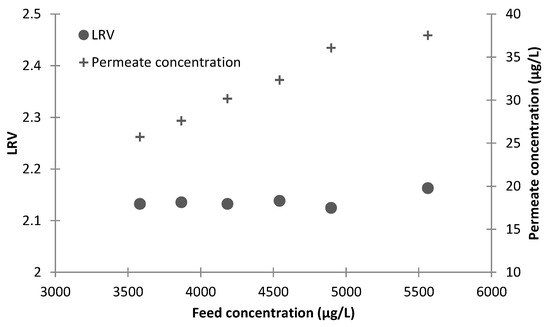 The RO system consisted of five-element array preceded by a 0.1 µm cartridge filter. The CCPs of RO were conductivity and PDTs, which were all in the required value range during the testing period. The RO was also challenged with Rhodamine WT, and the results are shown in Figure 10. The RO membrane barrier was able to achieve greater than 2.1 LRV for Rhodamine WT, which indicates that the membrane was able to achieve 2 LRV for virus, although only 1 LRV was claimed based on on-line conductivity measurements.