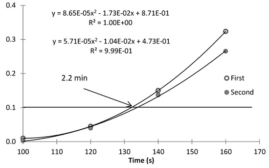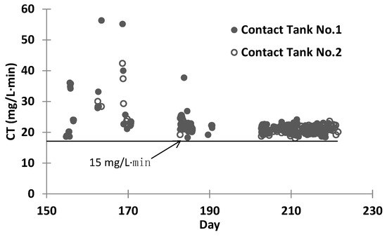 The T10 of the two UV units connected in series was 2.2 min, as shown in Figure 12. The online measured UVC intensities of both UV units were greater than 90 w/m2. Therefore, the dosing for each unit is about 600 mJ/cm2, which is much greater than the critical value of 186 mJ/cm2.