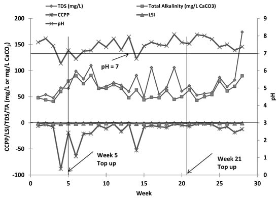 Figure 13 shows the measured pH, alkalinity and total dissolved solids (TDS) against time. This data, along with the temperature, was used to calculate the CCPP and LSI values. The CCPP values were all below 0, and three points were significantly lower than 20 mg/L (−88, −64, −52 mg/L). The three outliers were believed to have arisen from pH measurement errors, as pH was hard to measure occasionally. Ignoring these three outliers resulted in an average CCPP of −8.55 mg/L CaCO3 that corresponds to mildly aggressive water, with most CCPP data being between −2 to −12 mg/L CaCO3. Calculated LSI values also indicated mildly aggressive water with values between −0.5 and −1.3. The amount of water processed by the calcite contactor between re-filling events was estimated to be 600,000 L of water.