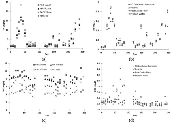 The TN and DOC post each barrier are presented in Figure 15. BAC and RO are the major barriers for TN and DOC. There were about 44% and 94% DOC rejection and 9% and 95% TN rejection on average through the BAC barrier and RO barrier respectively. The ammonia in the BAC effluent was only detectable if the ammonia concentration in BAC influent was greater than 2.0 mg/L, which means ammonia was nitrified in the BAC [13].