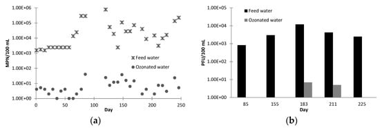 The ratio of produced and transferred ozone to the wastewater is listed in Table 3. The ozone transferred to the feed water was in the range of 60% to 80%, and did not show a clear relationship to the pressure in the contact tank. However, maintaining the dosed ozone >11.7 mg/L was sufficient to ensure >2 LRV for bacteria and virus [11].