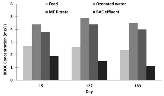 The BDOC across each barrier is shown in Figure 17, and the BDOC increased up to 88% post ozonation, reduced about 10% post the ceramic membrane, and reduced further by up to 70% post BAC. However, the BDOC concentration post BAC was still greater than 1 mg/L, which is sufficient to cause bio-fouling of the RO membrane. Therefore, an increase of the BAC EBCT is suggested.