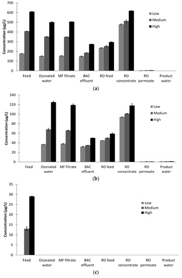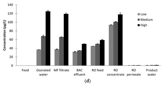 The concentrations of halide and oxyhalide ions are shown in Figure 18, in which 0 was given to the limit of detection (LOD) value. As expected, the iodide was oxidised completely post ozonation (Figure 18d), in comparison to the 14%–18% conversion of bromide to bromate [15]. The BAC and RO (Figure 18a–c) were the main barriers for bromide, bromate and iodate. Although BAC is not usually considered able to remove bromate and bromide [16], more than 15% removal was observed for bromate and bromide. BAC filtration removed approximately 46% of the bromide for the medium and high bromide/iodide concentrations. This is considered to result from ozonation of the feed in the presence of high organic carbon concentrations. The reaction of ozone with bromide to form bromine is rapid (HOBr + BrO−) (k = 160 M−1·s−1), but the subsequent reaction for bromate formation is relatively slow. Hence, the bromine preferentially reacts with organic carbon to form AOBr that is adsorbed onto the activated carbon. While high bromide concentrations were detected, it is proposed that it was actually in the form of bromine. Quenching of the samples during collection reduced bromine to bromide. Since the BAC had been soaked in the plant water for more than 10 months (earlier than the plant trial) before sampling and should have reached adsorption equilibrium, the reduction of bromide and bromate could also be partly due to biological activity. RO removed about 98.5% of total bromide and bromate, and about 99% of the iodate.