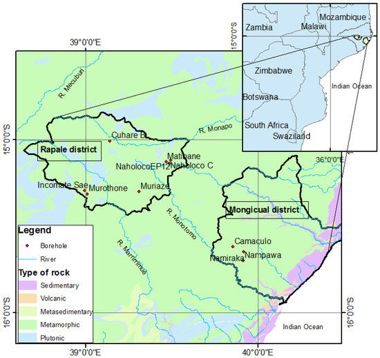 The study area shown in Figure 1 is situated in Nampula province in North of Mozambique. The Rapale district is located in central part of the province and close to Nampula city and Mongicual city is located in the East part of the province. The study area belongs to a tropical region. The general elevation ranges from 40 to 300 m above the sea level (masl) in Mongicual district and from 400 to 550 masl in Rapale district. However, the presence of Inselbergs increases elevation locally in both districts. The populations in both districts are using groundwater extracted from the wells drilled in deep weathered and fractured gneiss. During the rainy season, the population extracts water from the seasonal rivers crossing both districts.