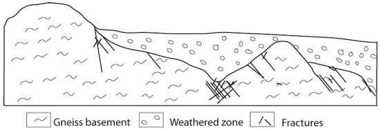 The basement rock in the study area has low porosity and permeability. The secondary porosity is formed due to the dynamic process of weathering. The weathering front acts along the fracture, fissure, and joints over a period of time, thus advancing the process of weathering. The weathered layer forms the repository for groundwater accumulation and movement [13]. The yield is lower than 3000 L/h [14]. The paleo sand dunes have low porosity and permeability due the weathering process and the productivity is conditioned by the thickness of the weathered layer. The yield of these aquifers is variable. It can reach 5000 L/h where the weathering is insignificant [14].