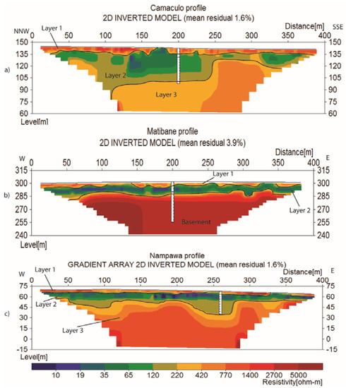 ERT survey have been conducted, as mentioned before, at 22 boreholes in the study areas. The inverted ERT models were classified in three different layers based on the information of Acworth weathering profile. Examples of inverted ERT models from the Camaculo, Matibane, and Nampawa profiles are shown in Figure 3.