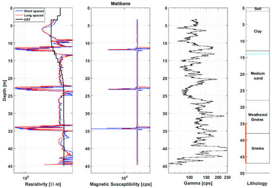 The measured natural gamma in borehole Matibane is in range of 50–200 cps for the bottom layer and 100–200 cps for the upper layer. This range of natural gamma is common in gneiss rocks [26]. The inverted ERT model of Matibane borehole shows a high resistive layer interpreted as fresh gneiss (Figure 2b). The observed peak between these two layers can be interpreted as a wellbore damage zone or as lithological variation that could be associated with clay-infilled fractures. The resistivity log does not clearly indicate any fracture zone, but this may be because the resolution is insufficient and it might have been detected if the uncased borehole was logged with a focused resistivity probe. It would have been possible to correlate the natural gamma signatures with lithology if more detailed documentation of the boreholes existed, especially if the drilled borehole would have been cored. A rock sample that gave a natural gamma value of 600 cps investigated by Gundersen and Wanty [27] gave indication of vertical fractures filled by clay. Maybe a lithological classification based on interpretation of natural gamma could provide useful information, however, due to lack of borehole details, it is not possible to add more conclusions from the results.