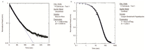 The Figure 6 respectively presents example of the Bouwer and Rice (Figure 6a) and the Cooper et al. (Figure 6b) solution fit to the measured head at the Camaculo borehole using Aqtesolv (HydroSolve, Inc., Reston, VA, USA) The field data fit well in both solutions except for the part after 120 s in Bouwer and Rice solution.
