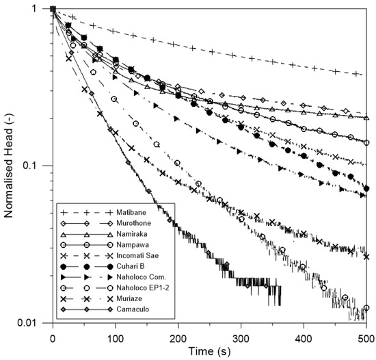 Normalized head of the displacements for the last slug test at all test sites for the first 500 seconds (adapted from [22]).