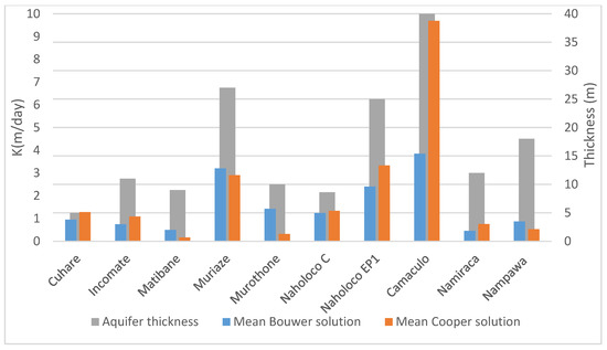 Results of hydraulic conductivity [22] from the Bouwer and Rice [23] and Cooper at al. [24] solutions and the thickness of the aquifer at each borehole.