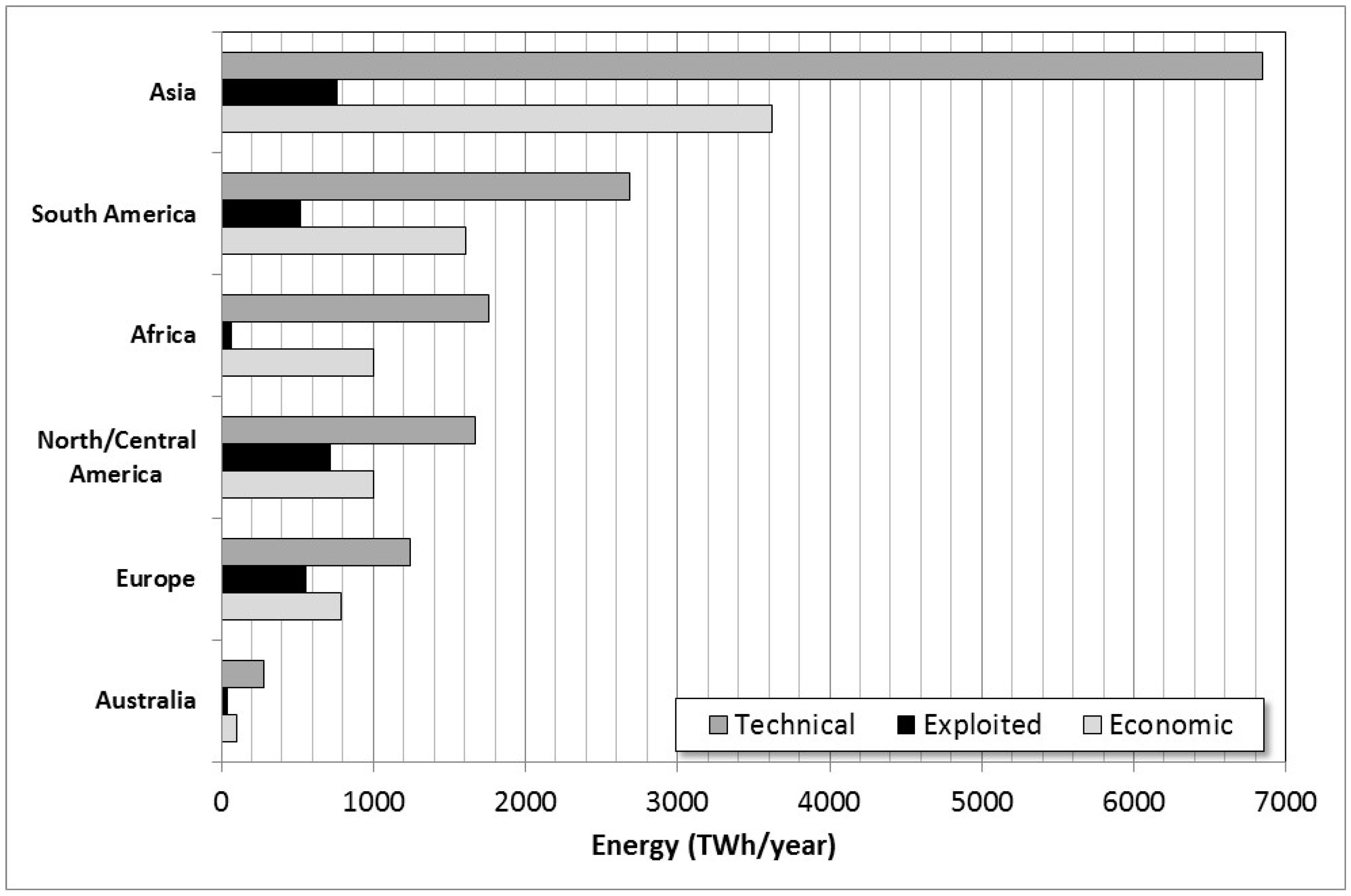 Among all of the different types of renewable energy (e.g., photovoltaic, solar thermal, tidal, and wind), the hydropower plant stands out for its feasibility. Historically, large installations can be found in dams around the world to take advantage of the potential energy created by different water levels. The most important hydropower plants are located in countries such as China, the United States, Brazil, and Canada. Currently, China has the greatest installed capacity (exceeding 240 GW), with production greater than 800 TWh in 2012 and an average growth of capacity of 20 GW/year [8]. In Brazil and Canada, hydropower plants represent 84% and 56% of the total energy consumption, respectively. The production of this type of energy in these countries reaches 16% of the total consumed energy [9,10]. Figure 1 shows the technical, economic and exploited potential on each continent.