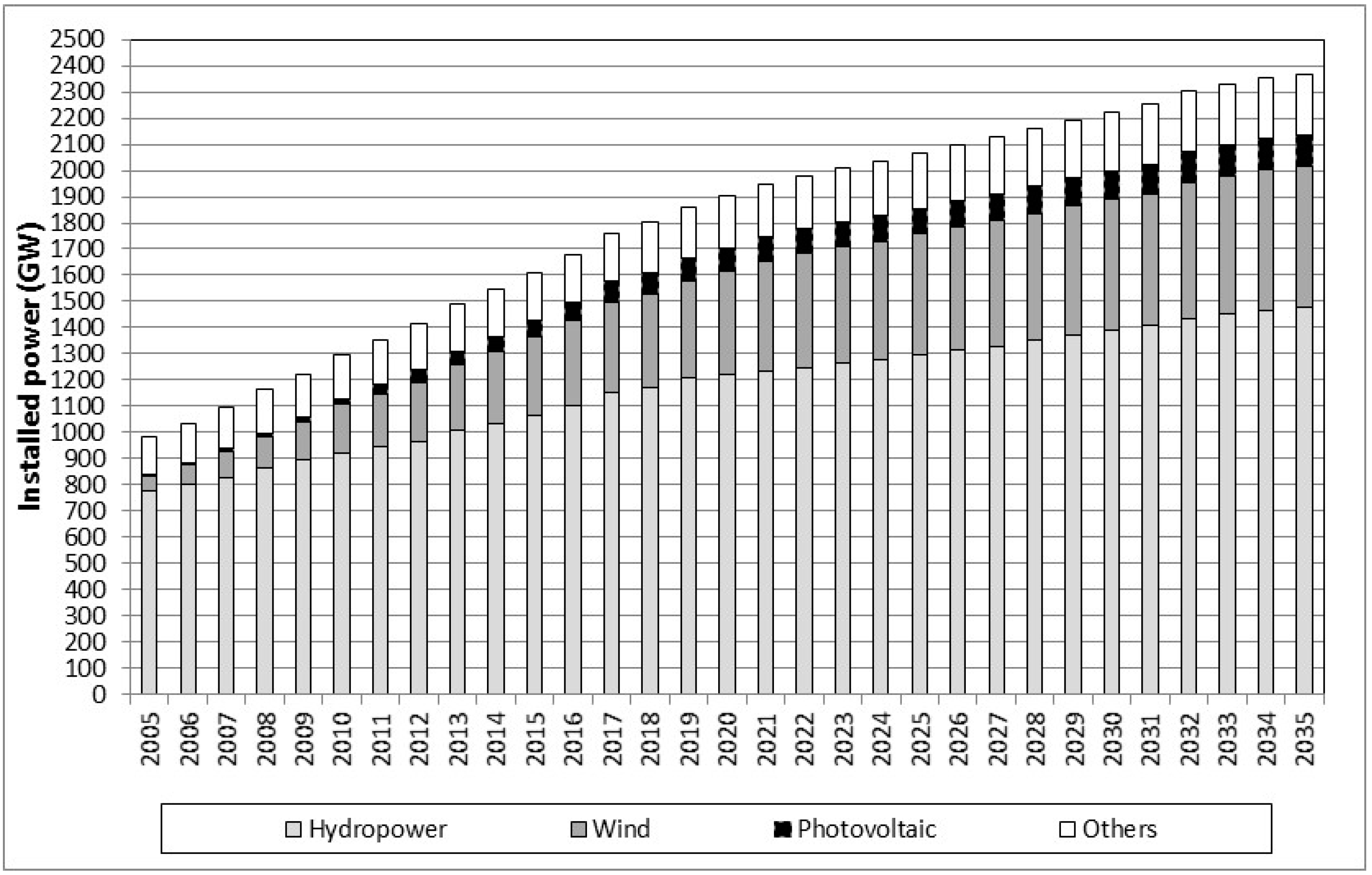 Going further, Spänhoff [12] performed a worldwide projection of the installed capacity of renewable energy for the United States Energy Information Administration. Hydropower has been the largest renewable source of energy in the period 2004–2010, and it will probably have the highest installed capacity in 2035. According to these forecasts, the installed capacity of hydropower will exceed 1400 GW. This installed capacity will be three times higher than that of wind energy and more than fifteen times greater than that of photovoltaic energy (Figure 2). The actual implementation of these renewable energy systems (solar and wind) in 2016 has been lower than the predicted values (Figure 2). The installed solar capacity is only 30% of the predicted capacity; the wind capacity is only 70% of the predicted value, and the hydropower capacity is approximately the value indicated in Figure 2 [13].