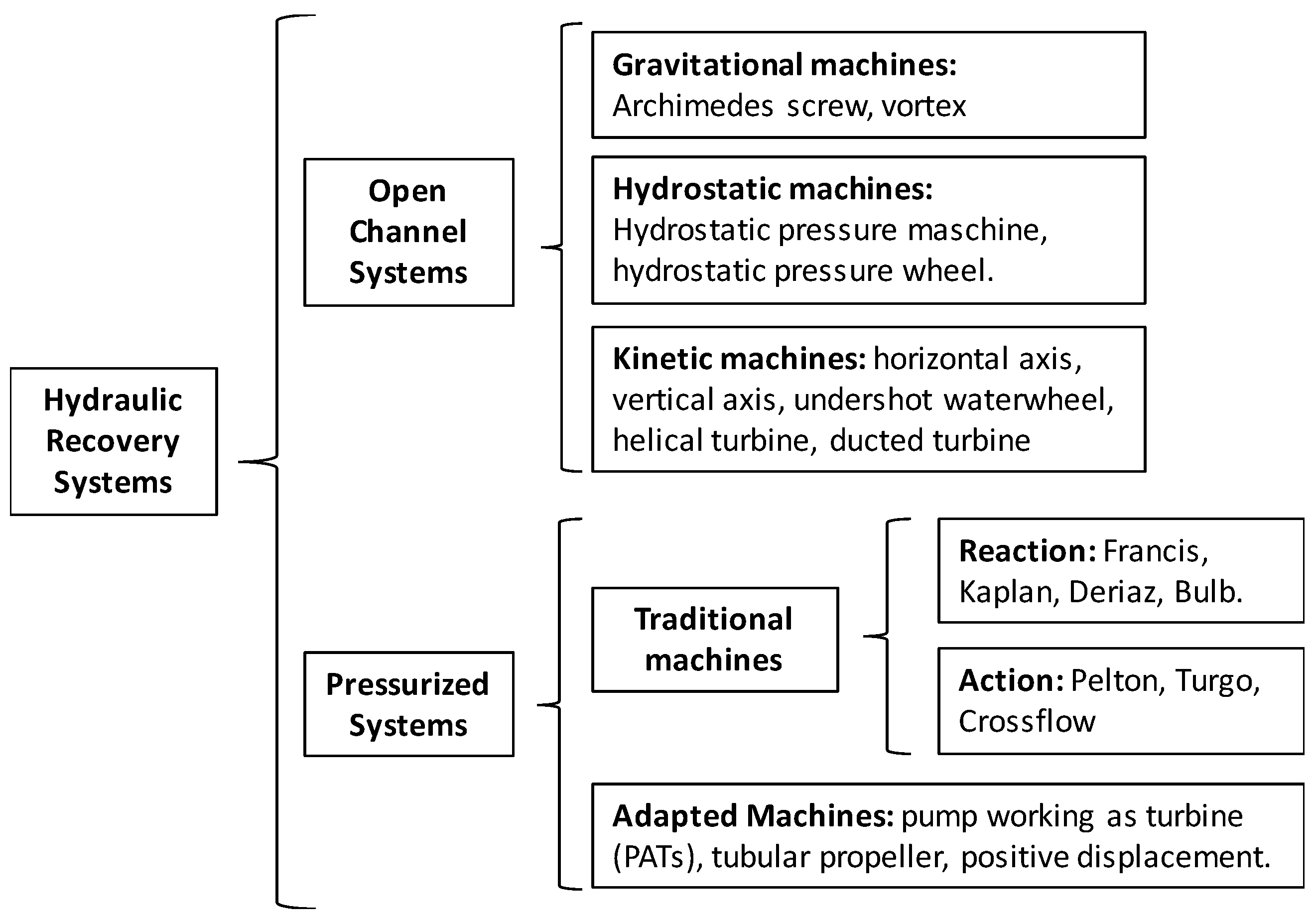 Hydraulic machines are classified according to the system (pressurized or open channels) in which they are installed (Figure 4). In open channels, all types of hydraulic wheels have been traditionally used to take advantage of waterfalls. According to the type of energy used (potential, pressure, or kinetic), the machines are classified as gravitational, hydrostatic, or kinetic. Gravitational machines take advantage of different water levels to extract energy from the flow (e.g., Archimedes screw or waterwheel). Hydrostatic machines operate by the difference of hydrostatic pressures on both faces of a blade (e.g., hydrostatic pressure wheel). Finally, if a wheel uses the velocity of the flow to move the axis of the machine, this type of machine is called a kinetic machine. There are many different types of kinetic machines (e.g., helical turbine with vertical or horizontal axis, overshot wheel, and ducted turbine) [51].