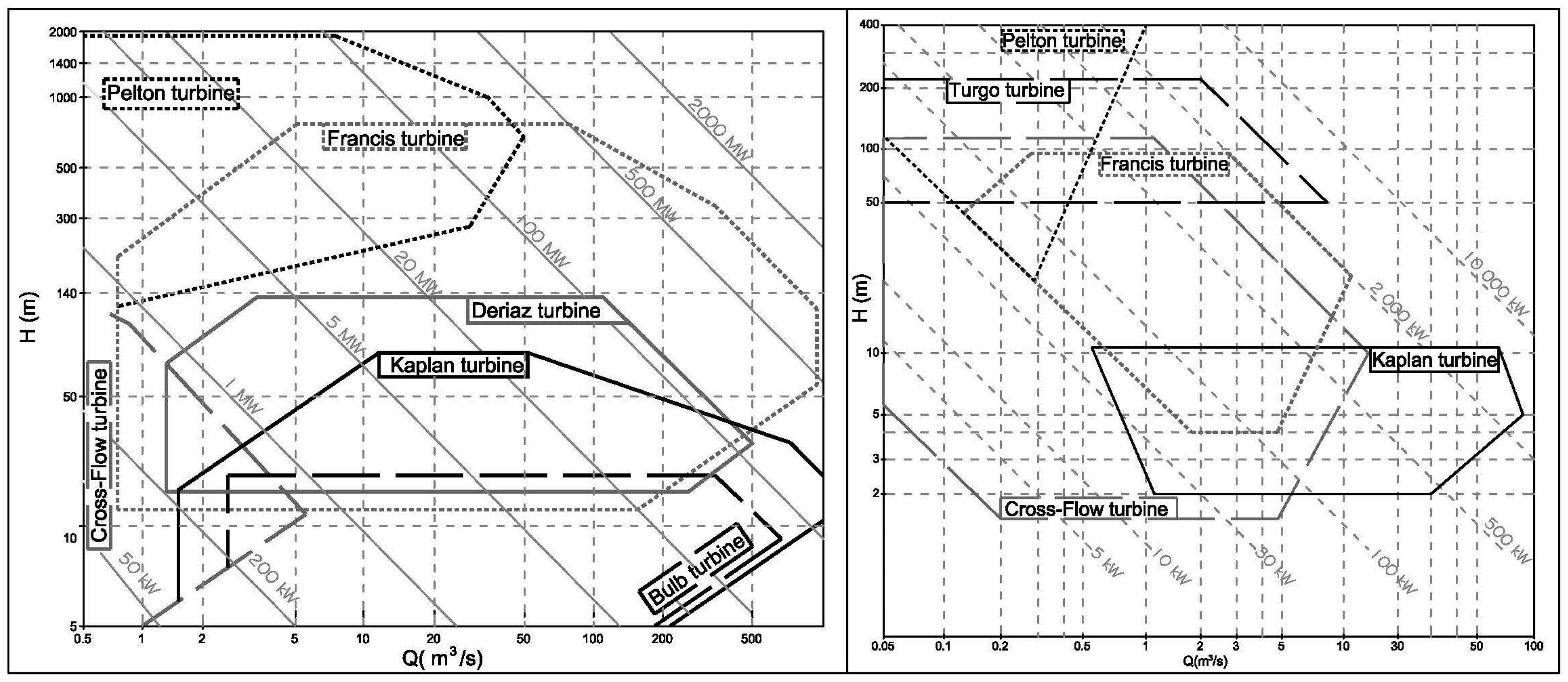 Selection of turbine depending on head and flow in: large (left); and small (right) hydropower [16,31].