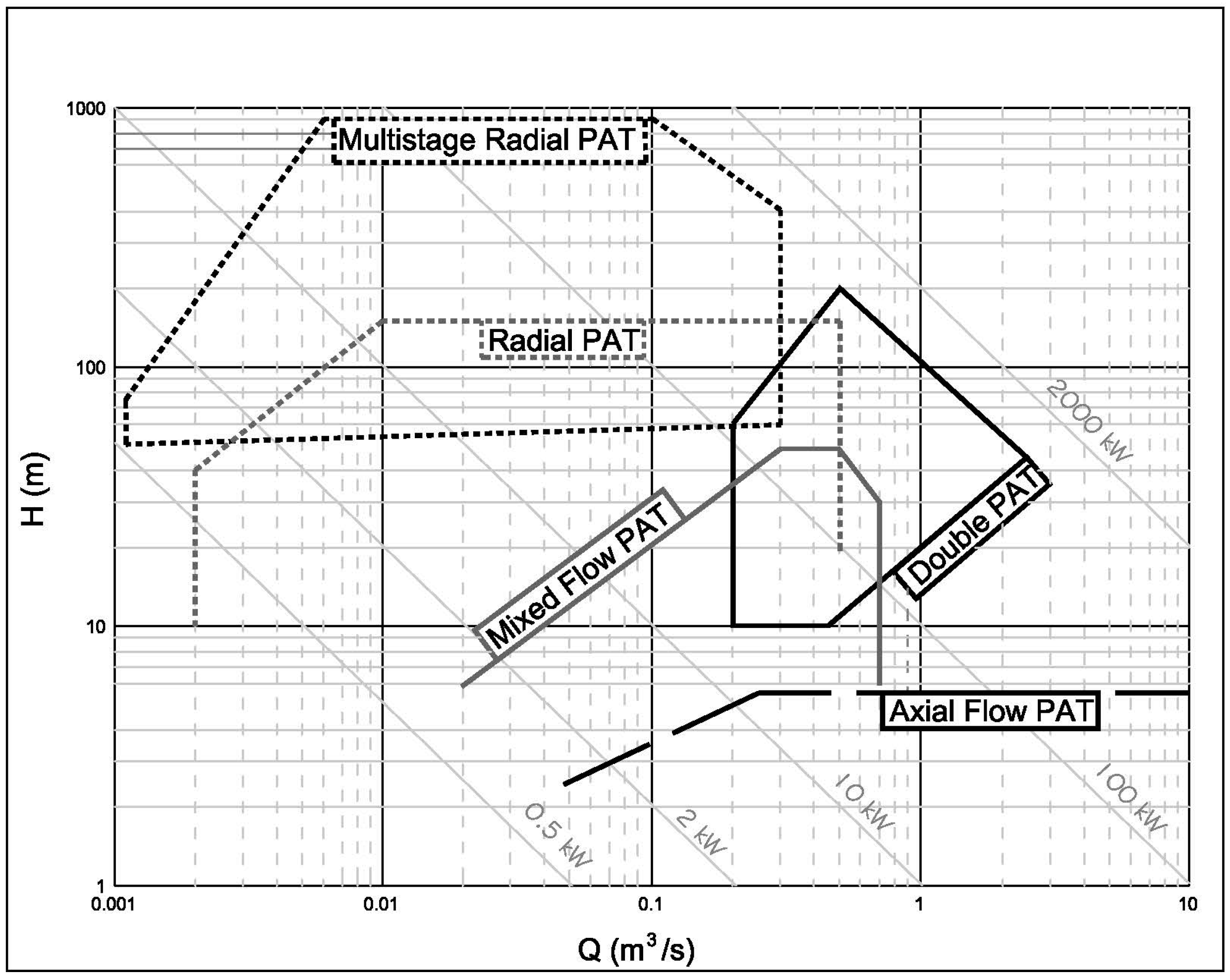 In 1931, Thoma [54] implemented the first pump working as a turbine (PAT). Later, other authors presented more research that presented the description, operation, performance, and theoretical model of these machines [57,58,59,60,61,62,63,64]. PATs are normally used in pressurized water networks but they can also be used in open channel flows when complementary civil works are carried out to adapt to PAT operating conditions. These machines present a high range of flow and head for installation according to the typology of the machine (Figure 7). The best efficiencies vary between 40% and 70% as a function of the specific speed [58].