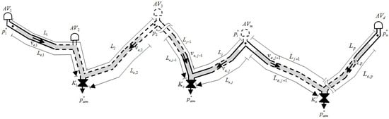 - Continuity equation [,]:and by deriving:where is the air mass and is the air volume of the air pocket i.Due to the air pocket i located between pipes and , then and , thus:where is the air density of the air pocket i, is the air density in normal conditions ( ), is the cross section area () of the air valve m and is the air velocity in normal conditions admitted by the air valve m.