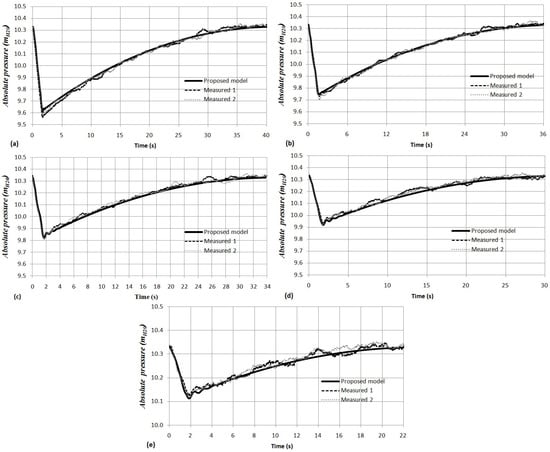 Comparison between computed and measured absolute pressure oscillation patterns (air valve S050): (a) Test No. 1; (b) Test No. 2; (c) Test No. 3; (d) Test No. 4; (e) Test No. 5.