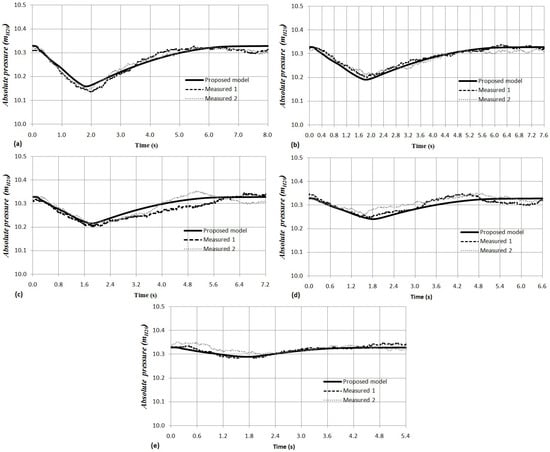 According to the results, there are two types of behaviours that depend on the air valve: (1) air valve  (see Figure 5) and (2) air valve  (see Figure 6). In all tests, the proposed model can predict the subatmospheric pressure pattern. Test No. 1 and Test No. 6 were selected in order to compare results.