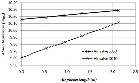 It is important to identify the great influence of the size of the entrapped air pocket on the minimum of the subatmospheric pressure. Figure 9 shows the results taking different air pocket lengths (, , ,  and  m). The smaller the air pocket size, the lower subatmospheric pressure is obtained. Equation (15) shows this situation with the comparison between the gradient of the absolute pressure () and the air pocket volume (). For the air valve , subatmospheric pressures are found in the range of 9.61  and 10.11 , while, for the air valve , small variations are found between 10.16  and 10.32 , showing the adequacy of this air valve for the emptying process. It also shows the importance of the air valve size since it can induce critical conditions associated with the subatmospheric pressure occurrence.