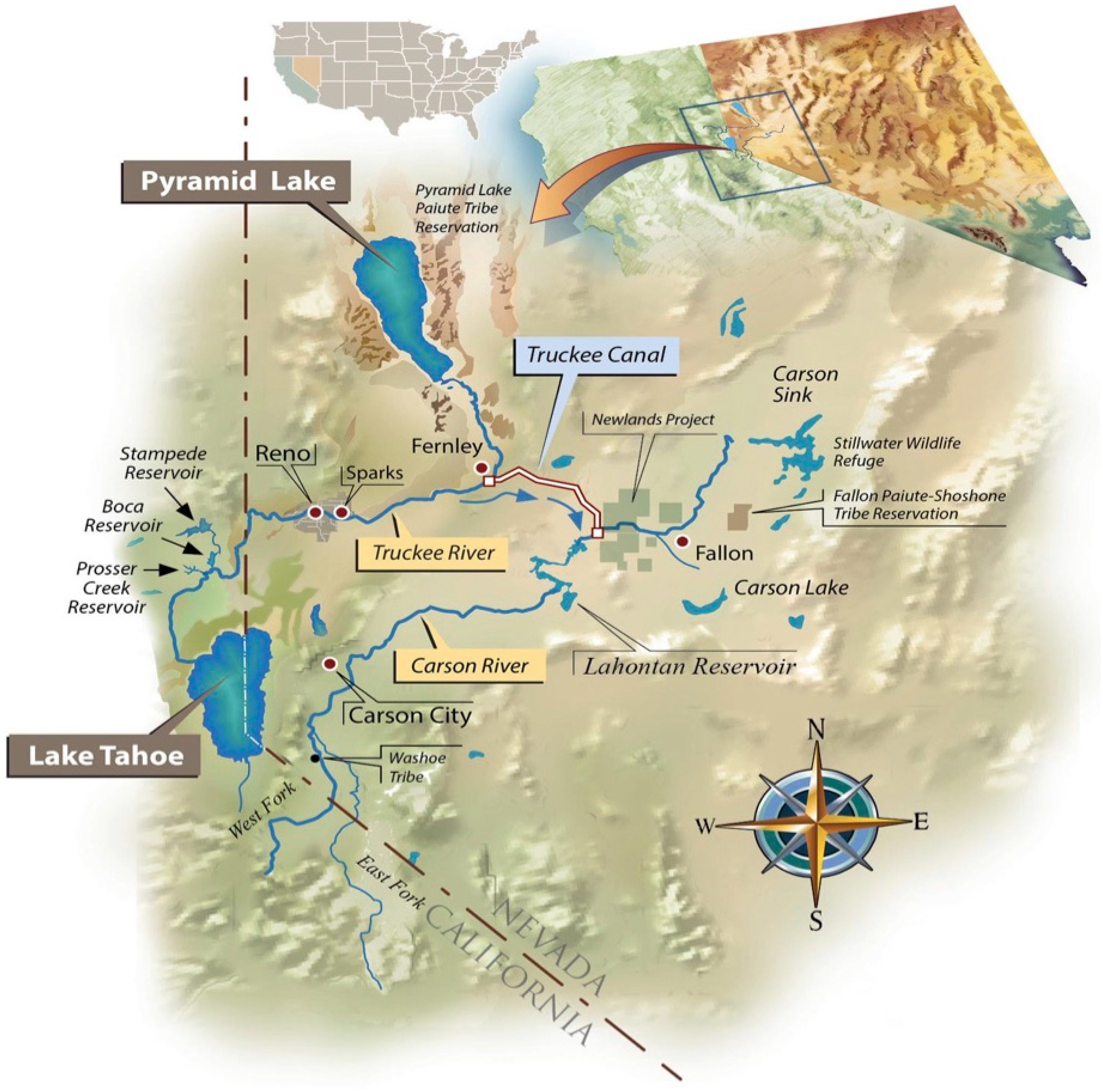 The Truckee River Basin encompasses approximately 7925 km2. While 75% of the basin lies in northwestern Nevada, a majority of the water storage exists in the snowpack, streams, and reservoirs of eastern California’s Sierra Nevada. The 1971 California-Nevada Interstate Compact allocated 90% of the Truckee River’s waters to Nevada.