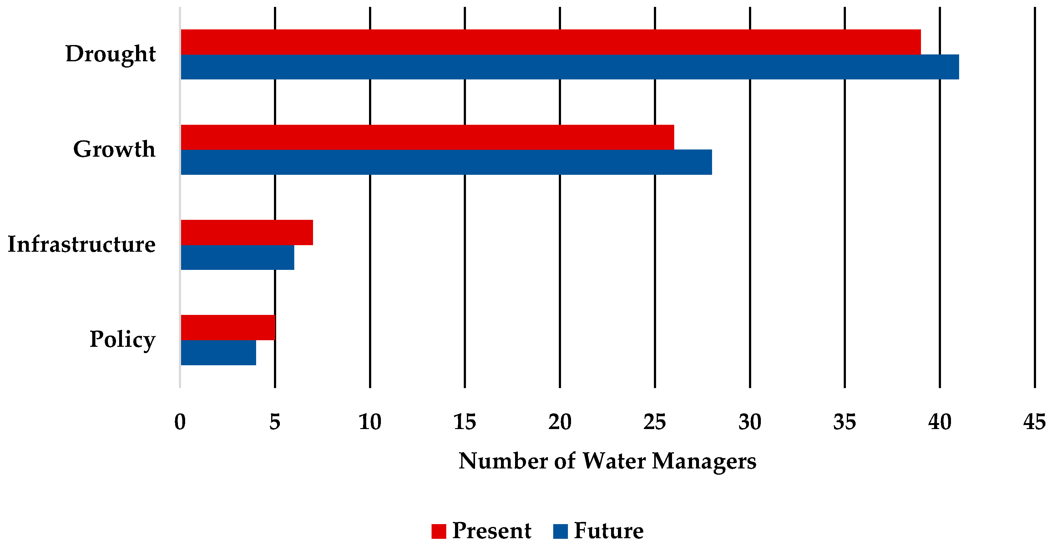 When asked what are the greatest stressors on the river system presently, the majority of those who responded (n = 63) answered drought (n = 39), followed by population and economic growth (n = 26) (Figure 3). These results were nearly identical regarding future stressors. Several water managers noted that water delivery infrastructure and water management policies comprise both present and future stressors. To address these challenges, respondents suggested repairing or replacing antiquated and degrading infrastructure, building additional water treatment infrastructure to enhance supplies, and modifying current water policy.