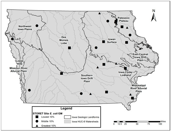 To explore relationships in watershed characteristics and water quality data, thirty of the STORET monitoring sites were selected for spatial analysis. The 395 STORET sites were ranked in order of ascending E. coli GM concentration and three subsets of 10 randomly selected STORET sites were selected using the subset tool in the JMP software package (SAS); 10 sites were selected from the lowest 10% of GM E. coli (8–105 CFU/100 mL), 10 from the middle 10% (415–561 CFU/100 mL), and 10 from the highest 10% (1,536–31,311 CFU/100 mL). The E. coli GM concentrations were spatially joined to the Iowa STORET monitoring sites and the 30 randomly selected monitoring sites are shown in Figure 2.