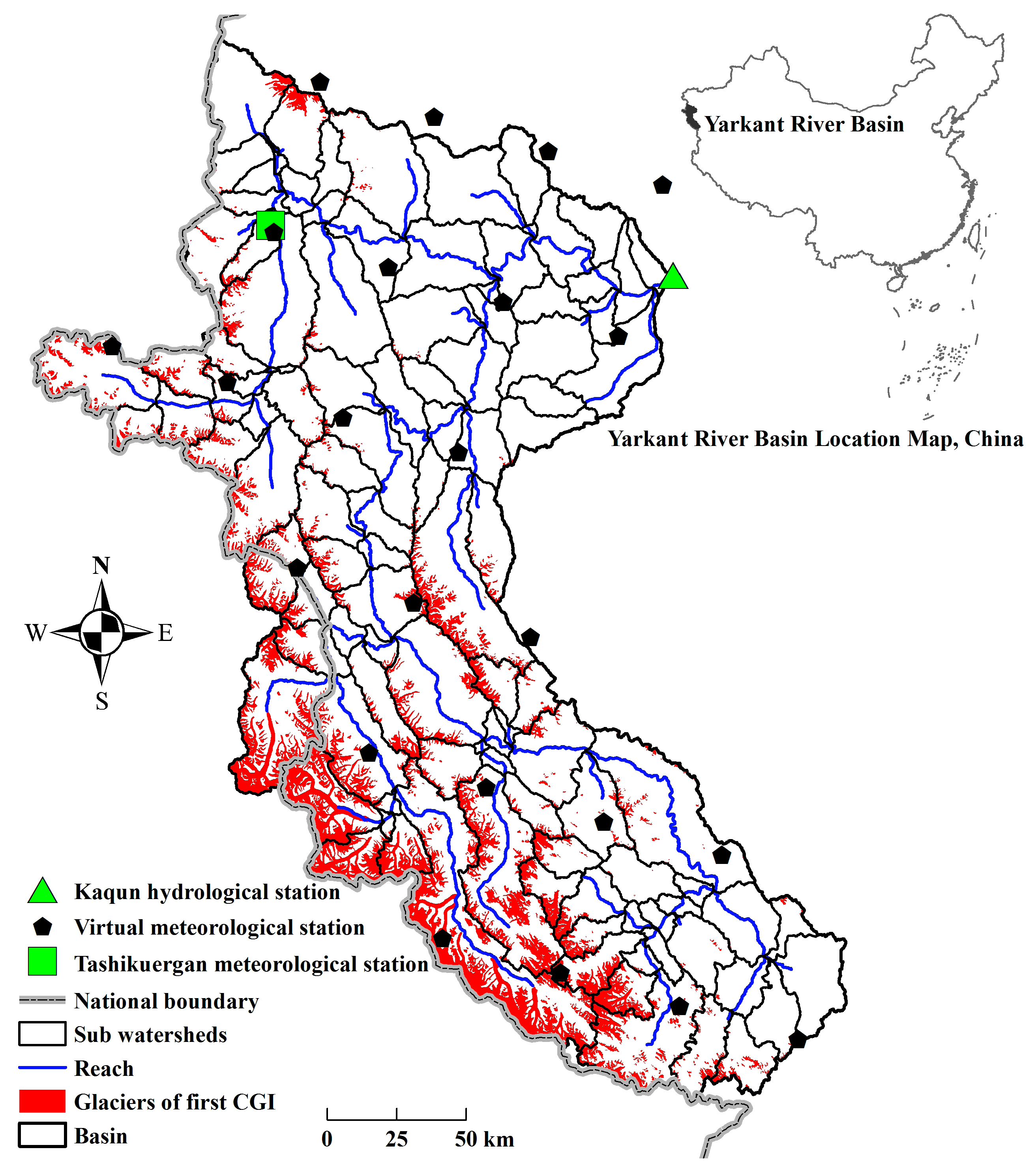 Two periods for digital vector map of glaciers were obtained from the first and second China Glacier Inventory (CGI), based on aerial photos acquired during the period 1962–1977 for the first CGI, and remote sensing Landsat TM/ETM+ and ASTER images over the period 2004–2011 for the second. The first CGI data were used to determine the initial spatial distribution of the glaciers for the calibration period, while the second CGI data were similarly used for the validation period. There were 3070 glaciers in the study area with a total area of 5894.86 km2 and a total volume of 690.25 × 109 m3 for first CGI, and 3503 glaciers, with a total area of 5113.27 km2, and total volume of 592.19 × 109 m3 for the second CGI. The extent of glaciers for first CGI has been shown in Figure 1. In order to use accurate distribution map of the glaciers to drive the SWAT model, the CGI glacier map for the two periods were merged with the land use map for generating the hydrologic response unit in the SWAT model. Based on the underlying GIS-reference data and the glacier data, the study watershed was divided into 114 sub-watersheds and 2379 hydrologic response units (HRUs) including 182 glacier HRUs for the calibration period and 2382 HRUs including 185 glacier HRUs for the validation period.