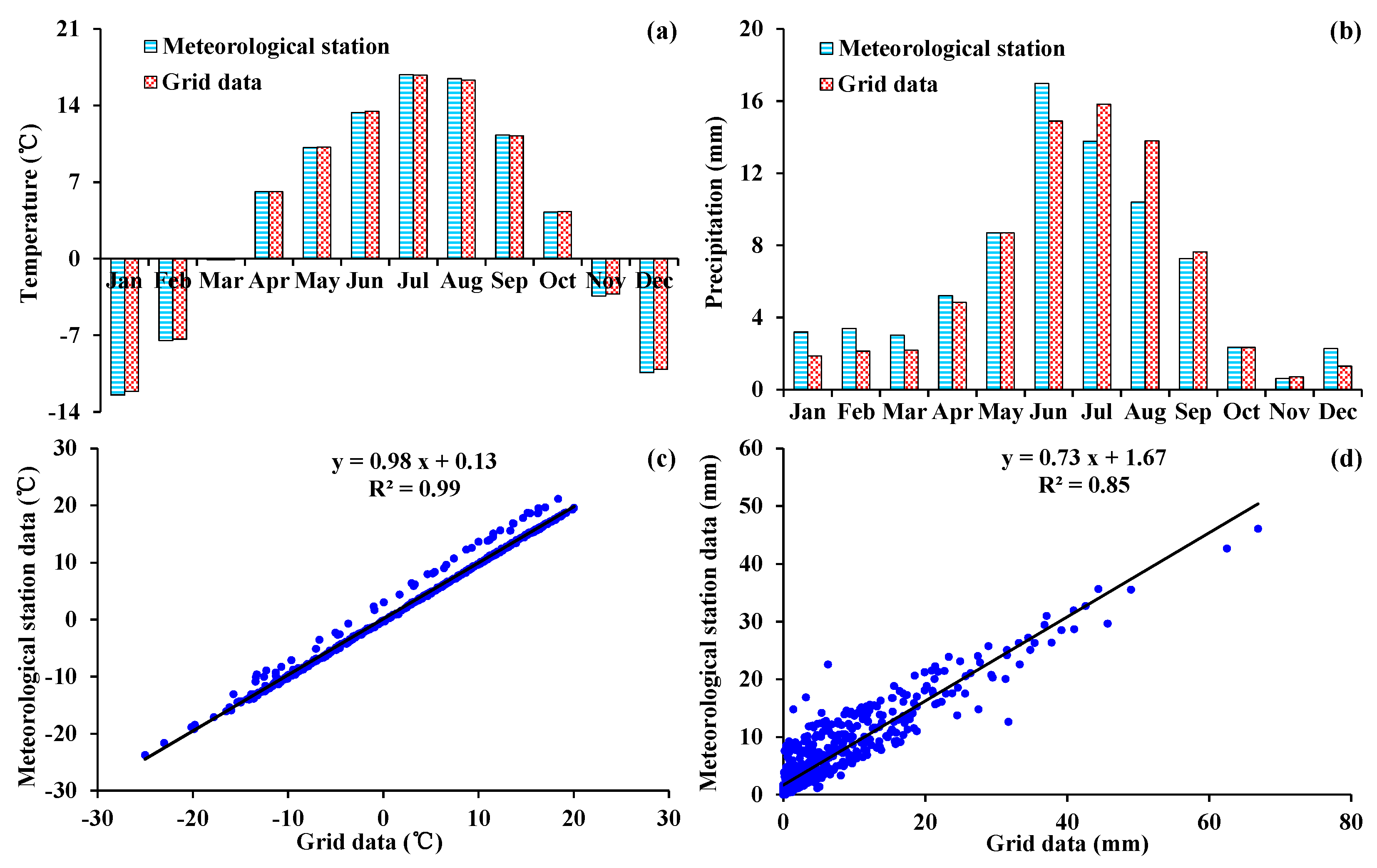Comparison of the meteorological station-based air temperature and precipitation with the nearest grid data; (a) mean monthly air temperature; (b) mean monthly precipitation; (c) correlation between the meteorological station monthly air temperature and that of the nearest grid data; (d) correlation between the meteorological station monthly precipitation and that of the nearest grid data. R2: coefficient of determination.