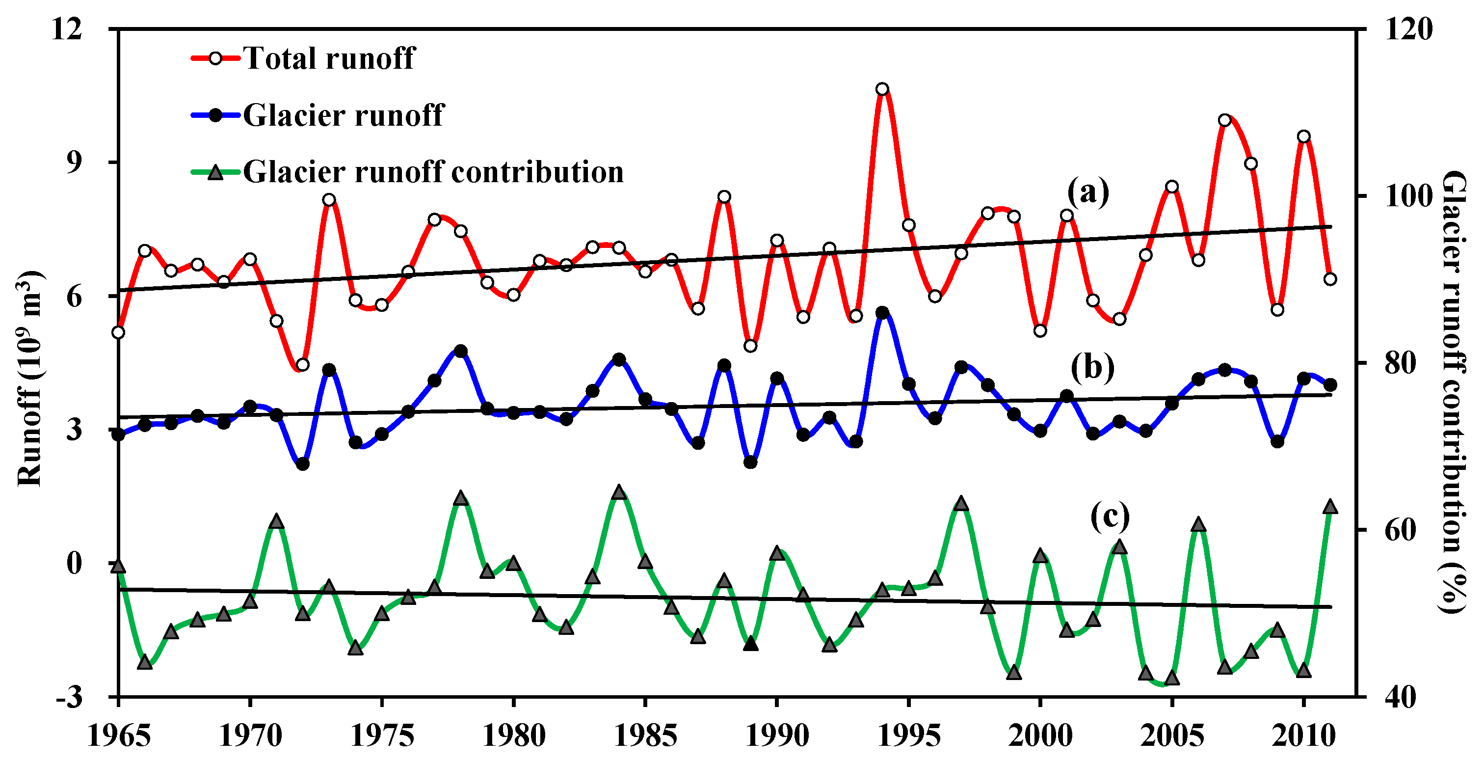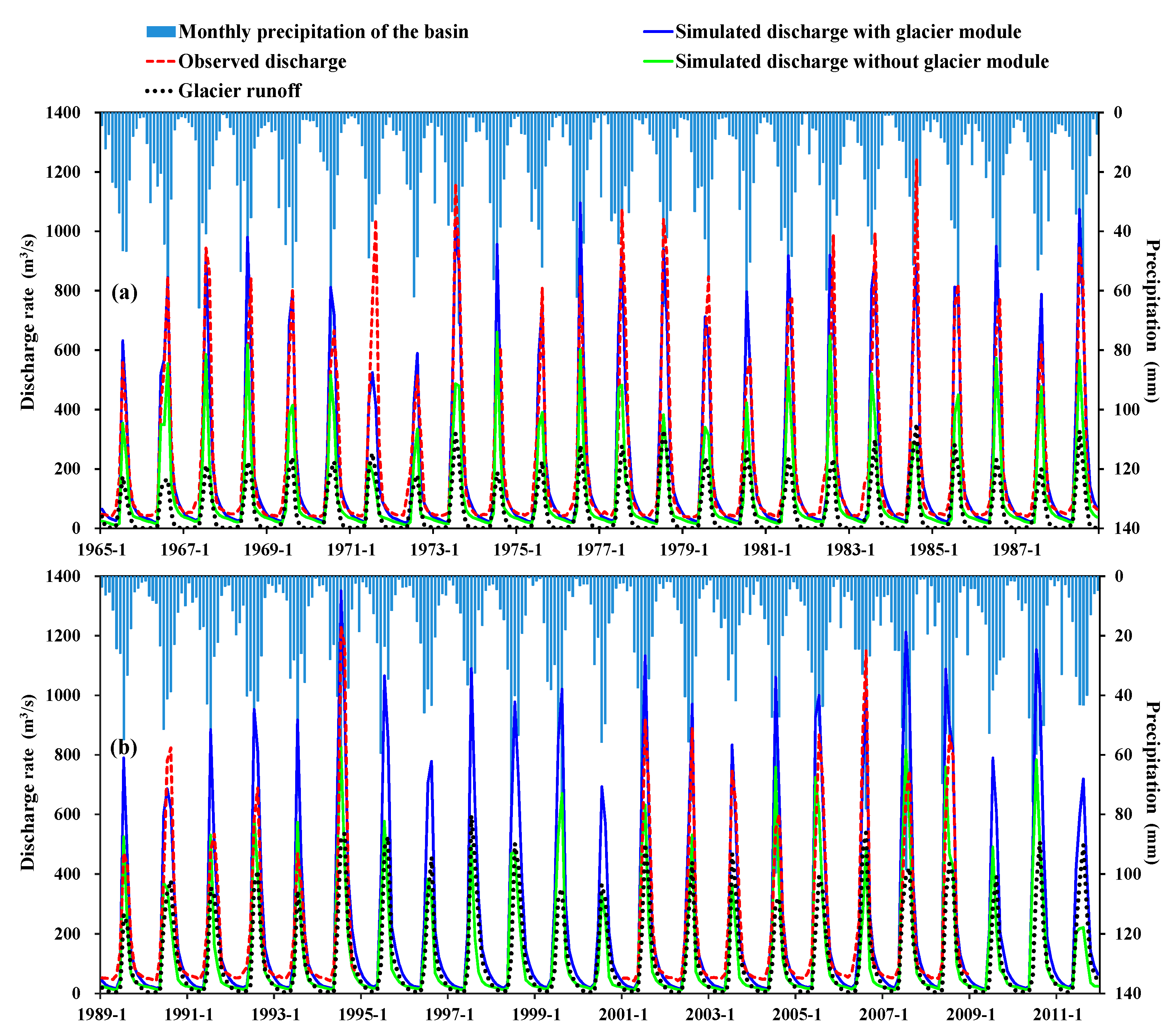 In an earlier study, Zhang et al. [21] employed a modified monthly degree-day model to estimate the glacier runoff in the Yarkant River Basin from 1961 to 2006. They reported that the total runoff in glacial areas exhibited an increasing rate of about 0.023 × 109 m3·a−1, similar to the result of our study. According to the study by Gao et al. [73], the glacier runoff accounted for 51.3% of the total runoff in the Yarkant River basin, which was nearly consistent with our calculated results that the glacier runoff contribution was 51.6% over the period from 1965 to 2011. Moreover, the impacts of temperature and precipitation on runoff in the Tarim River during the past 50 years indicated that both represented continuous increases of 0.04 °C 10 a−1 and 11.2 mm 10 a−1 for the Yarkant River basin, respectively [74], and meanwhile, the annual runoff exhibited an increasing trend. In this study, simulated annual and total precipitation increased by 10.5 mm 10 a−1 and 0.045% 10 a−1, respectively. According to the study in the Tarim River Basin [73], the river flow increased by 12.8% during the period from 1961 to 2006, of which approximately 1.8% was contributed by the increases in precipitation, and the others amounting to 11.0% originated from the glacier runoffs. That means that the increased glacier runoff accounted for as much as 85.7% of the increased river flows. Moreover, it is conceivable that the increased glacier runoff was caused by the increase of temperature.