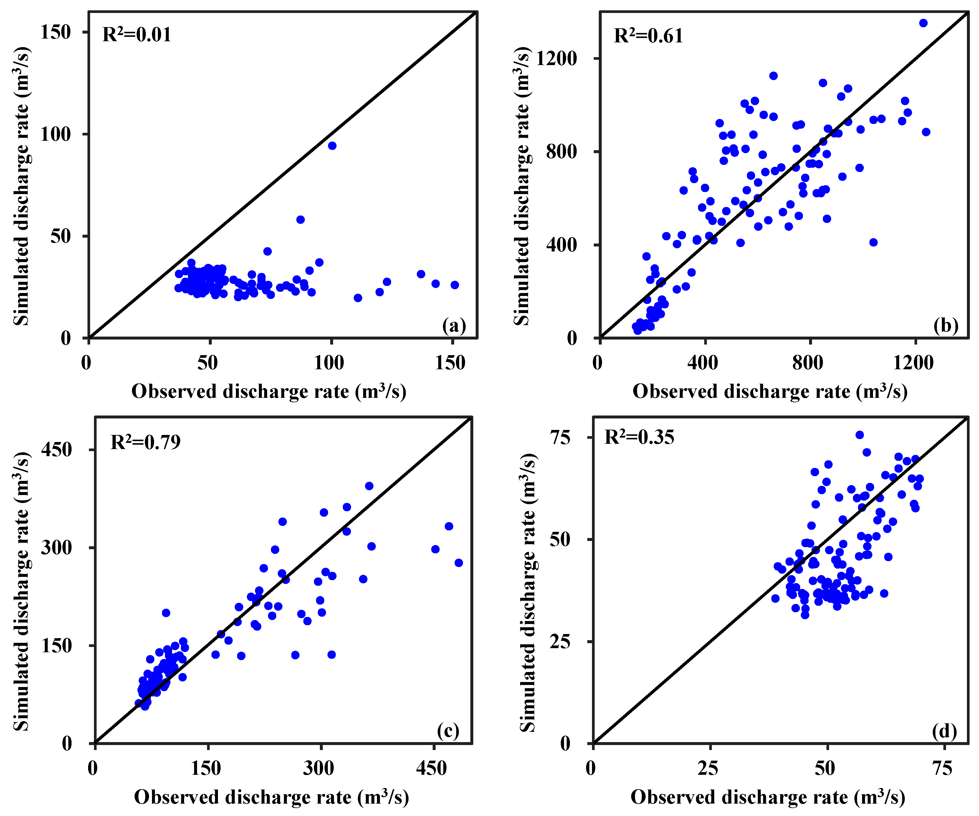The monthly discharge curves based on the simulated and measured data in the calibration and validation periods (Figure 4), demonstrate a close alignment of the two discharge curves, except for several underestimated values in the month of July in 1971, 1977, 1978, 1984, and 2006. Correlations of monthly measured and simulated discharge were also analyzed by the seasons, as shown in Figure 5. The oblique line in this figure shows that the measured discharge in fact equals the simulated discharge value, where the optimal results are located on the oblique line. The points located above the line indicate some degree of overestimation, while the underestimated values are shown below the line. Hence, it is evident that the discharge values were underestimated in the spring season. In accordance with Figure 5a–d and the correlation coefficients (R2), we can infer that the results of the summer and autumn seasons were satisfactory, and that the model performances in winter and spring seasons were unsatisfactory.