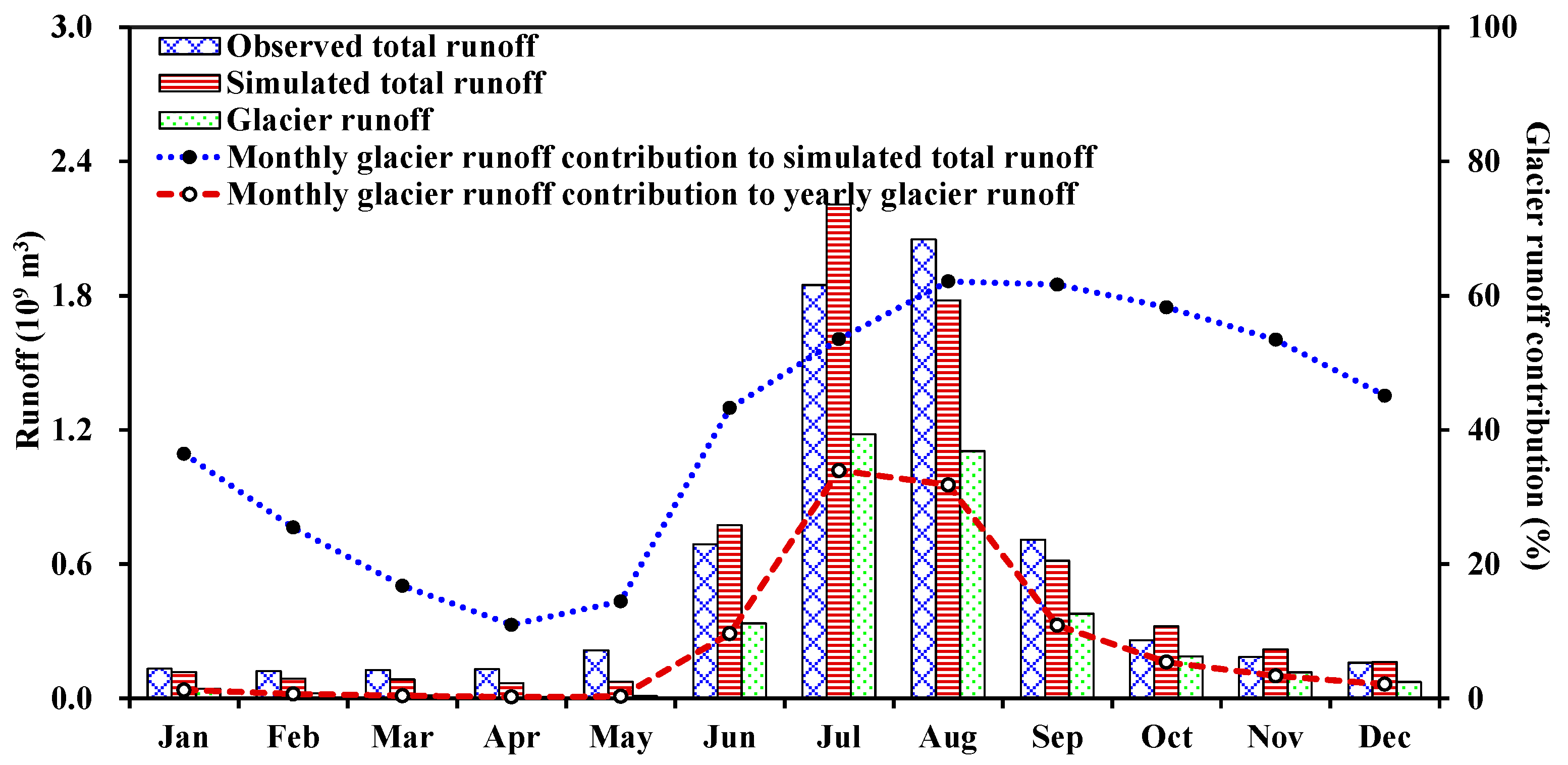 Multi-year monthly average observed and simulated total runoff, glacier runoff as well as its monthly contributions.