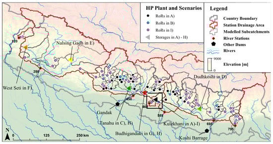 The Nepalese river system and 141 hydropower plants included under scenarios A)–I) in this study. Seven river stations used to obtain inflows are indicated as ‘+’; drainage areas for these stations were divided into 170 subcatchments for the flow path representation as indicated by dotted grey boundaries. Run of river (RoR) plants are indicated by circles and storage hydropower plants by triangles. Symbol colors differentiate between modeled scenarios summarized in Table 2 along with features of the various storage plants. Box indicates location of Kulekhani and surrounding basins shown in detail later. Source: Elevation based on [51] and coordinates for plants from [52].