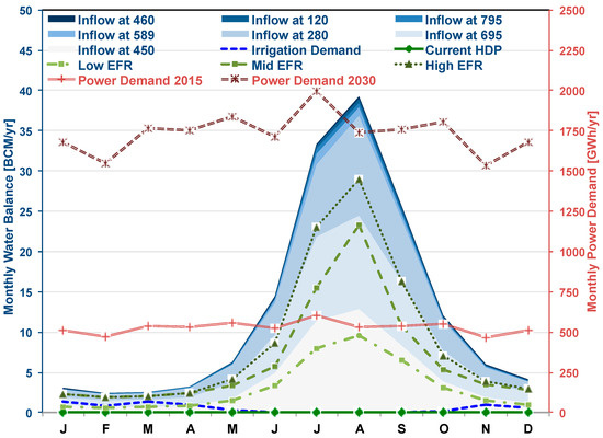 Average monthly pattern in water inflow at seven selected river stations, four different levels of environmental flow requirements (EFR), irrigation water demand, and power demand for 2015 and 2030. See Table 1 for data sources.