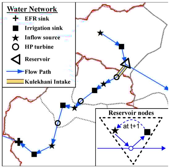 Cheng et al. [47] provide a generalized methodology to represent water distribution networks in terms of flow paths indicating all possible water delivery routes from each source node to the associated demand nodes. Such a flow path representation allows for automated setup of the model constraints, as described in Dhaubanjar [55]. Similar flow path representation is used here. Based on the Shuttle Radar Topography Mission (SRTM) 90-m Digital Elevation Model (DEM) for Nepal [51], 170 subcatchments shown in Figure 1 are delineated and a flow path network is set up. Figure 3 shows the conceptual flow path representation for subcatchments around Kulekhani storage plant. Each subcatchment is assigned an irrigation demand and an inflow source node. EFR is assigned as demand at the downstream river node. All demand nodes are sinks. Hydropower (HP) turbine nodes are added as needed for each scenario. Furthermore, Cheng et al. [47] decompose reservoir storage into a source and sink node to represent carry-over storage from one time step to another. Water allocated to the storage sink at time t drains into the storage source at time t + 1 as shown in Figure 3 (Scenario I) has the biggest system with 416 nodes connected by 968 flow paths. All water flows are evaluated in million cubic meters (MCM) at monthly time steps, so flow routing within the subcatchments is not considered.