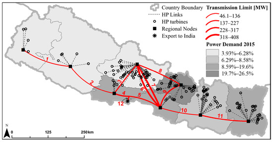 The power flow network is represented as indicated in Figure 4 by considering power transmission through eight regional power distribution centers. National power demand is distributed across the regions based on demand percentages recorded at the centers in 2015 [56,89]. Only regional connections from the existing transmission lines reported in [56] are considered. Free transmission is assumed between HP plants and their corresponding regional nodes through HP links as shown in Figure 4. The power and water system are coupled via the HP turbine nodes. Transmission lines for international power exchange only exist for India [56]. Power export is only allowed through one node to represent the existing Bardghat–Gandak line that is used for power exchange with India [90]. However, this export line is only modeled up to the substations on the Nepalese side. All power flows are evaluated in Gigawatt-hours (GWh) at monthly time steps.