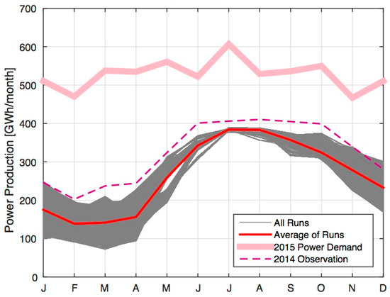 Comparison of observed monthly power production for 2014 (dashed lines) based on [57] and model outputs for existing scenario A) under HDP based EFR and power demand for 2015. Gray lines represent output for each of the 14 simulated years in the 1606 optimization runs, while the red line indicates the average for all runs.