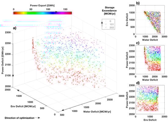 Pareto optimal solution set identified for Dudhkoshi with mid EFR level and power demand for 2015. The three axes in (a) represent average annual values for national irrigation water deficit [MCM/year], EFR deficit [MCM/year] and power deficit [GWh/year]. Power export [GWh/year] and storage threshold exceedance [MCM/year] are indicated by marker color and marker size, respectively. Arrows indicate direction of optimization. Insets (b–d) show 2D views of the Pareto set. An interactive Matlab version of this figure is provided in the Supplementary Materials. A parallel plot representation of the same scenario is presented in Figure 7a.