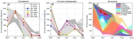 Subfigure (a,b) present parallel plots of the Pareto optimal sets for scenarios D) and H) with mid EFR and power demand for 2015. Light and dark gray lines represent Pareto sets obtained for optimization model run with and without transmission line limits (TLLims). Colored lines highlight five Pareto optimal points from the models with TLLims that optimize each of the five objectives individually. Irrigation water deficit (Wdef), environmental deficit (Edef) and storage threshold exceedance (Sexcd) are reported in [MCM/year]. Power deficit (Pdef) and power export (Pexp) are reported in [GWh/year]. Subfigure (c) presents overlaid parallel plots for eight power development scenarios from model with TLLims under mid EFR and power demand for 2015. Individual parallel plots are available in in the Supplementary Materials.