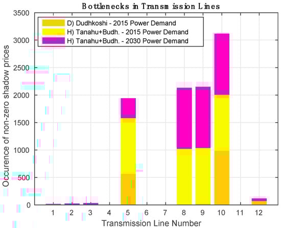 Figure 7a,b additionally provide a comparison of optimization results with and without inclusion of transmission line constraints in for scenarios D) and H). Figure 8 indicates identifies the transmission lines presented in Figure 4 that are limiting under these scenarios. For all other scenarios, obtained objectives had limited change between the runs with and without transmission line constraints. For scenarios G) and I), transmission lines were not limiting but the inclusion of transmission limits lowered the power deficit and export. Objective fulfillment varied most significantly with transmission limits for scenario D) because Dudhkoshi is located close to high power demand areas but with limited existing transmission lines. If transmission lines did not limit the power system performance, scenario D) would likely improve its power deficits minimization, making it a promising small storage scenario. Since storage threshold exceedance and power deficit have high tradeoffs, Figure 7a,b show that appropriate representation of line limits is also needed for realistic estimation of flood risk, especially for big reservoirs.