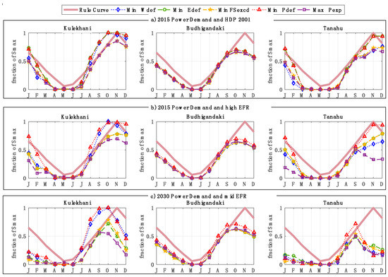 Figure 11 compares the operation of Kulekhani, Budhiganadki, and Tanahu in scenario H), when run with different EFRs and higher power demand for 2030. In Figure 11a,b, the operation of Kulekhani varies more in the dry period than it did in the scenarios in Figure 10 Since the two-storage scenario represents a big power upgrade that can easily reduce the power deficit to zero, the optimizer can focus on fulfilling other objectives. The higher EFR scenario can also be considered similar to a case accounting for Indian irrigation water demand occurring downstream of Nepalese river basins. The difference in reservoir operation for the two EFR levels can indicate the conflicts in water sharing between the two countries. Once power demand is higher again in Figure 11c, the variation in operation is similar again for the dry months. Increase in power demand results in reservoir accumulation and release beginning earlier for all three reservoirs. Operation policy for Tanahu changes significantly from dry-season, production-based to year-round production as the scenario is no longer able to fulfill wet-period power demands for 2030.