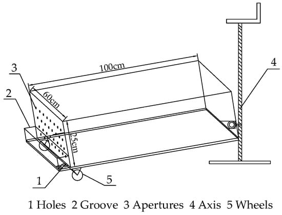 For a small-scale artificial rainfall experiment, the experimental plot is usually less than 5 m2 with the length, width and depth of the soil box at 1–2 m, 0.5–1 m and 0.22–0.5 m, respectively [37]. In our experiments, three identical steel soil boxes, each 1.0 × 0.6 × 0.25 m and with two wheels at the base, were designed to minimize experimental error. Each soil box had apertures on the side near the wheels to allow runoff and sediment to transport freely. The bottom of the box was extended 0.1 m outward along the long side and a groove with small holes was set on the right-hand side of the extension to collect runoff and sediment. On the opposite side of the groove, a regulating screw was attached so that the slope angle of each soil box could be adjusted from 0° to 65°. The structure of the soil boxes is shown in Figure 2.