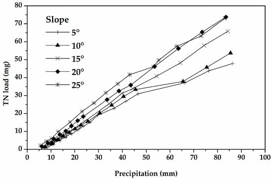During the process of rainfall, dissolved nitrogen, including dissolved organic nitrogen, nitrate nitrogen, and ammonium nitrogen were carried by rainfall runoff. Meanwhile, adsorbed nitrogen was adsorbed on soil sediments and then transported by water and soil loss. In the experiments, the correlations between precipitations and TN loads under five slopes were obtained, as shown in Figure 4.