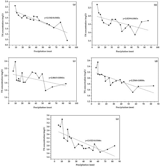 The correlations between precipitations and TN concentrations in runoff under various slopes are shown in Figure 5. Those under slope 5°, 10°, 15°, 20° and 25° are shown as Figure 5a–e, respectively. The downward sloping lines in Figure 5 show that TN concentration declines with increasing precipitation, though this is not the case for TN load.