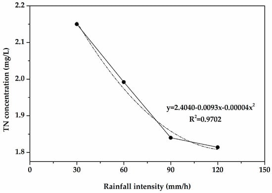 The effects of slope on TN loss will be discussed in Section 3.3.1. Rainfall intensity and TN concentration are negatively correlated, which can be formulated by a quadratic polynomial, and the square of the correlation coefficient (R2) is 0.9702. It can be seen that more runoff is generated under the condition of higher rainfall intensity. Meanwhile, the background value of TN in soil was consistent throughout our experiments; hence TN concentration declined as rainfall intensity increased.