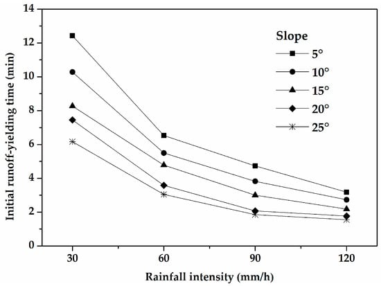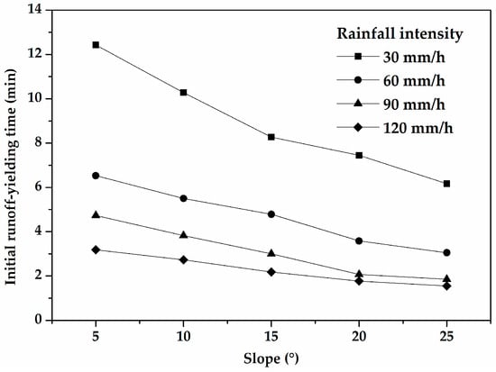 In Figure 7, the initial runoff time shortens when the slope rises, since increasing slope makes rainfall infiltration weaker and leads to easier runoff generation. It can be also seen that the effects of slope on the initial runoff time become indistinct as rainfall intensity increases to a certain degree. The difference among the initial runoff-yielding times on different slopes was obvious under a rainfall intensity of 30 mm/h: the longest time was 12.43 min on the 5° slope and the shortest was 6.17 min on the 25° slope. With increased rainfall intensity, the difference gradually diminishes. At a rainfall intensity of 120 mm/h, the difference between the maximum and the minimum is reduced from 6.26 min under rainfall intensity of 30 mm/h to 1.63 min. It can be seen that slope is a key factor affecting runoff generation when rainfall intensity is relatively small, and the initial runoff-yielding time decreases significantly as the slope increases. With rising rainfall intensity, the effect of rainfall intensity on runoff generation became more and more important, and the differences of the initial runoff-yielding times on different slopes lessen.