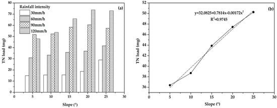 Generally, TN load rises as slope increases, under various rainfall intensity conditions. The influence of slope on TN load can be explained by the following aspects. For steeper slopes, the scouring effect is stronger, a larger amount of runoff is generated, more sediment is transported, and more serious TN loss occurs. Previous studies have shown that there is a critical value for TN loss on slopes, so that soil erosion and TN loss do not increase limitlessly with greater slope [42]. In our experiments, slight drops in Figure 8a also supported the idea that TN load might reach a peak with the rise of slope. TN load decreased slightly as slope increased from 20° to 25° under rainfall intensities of 90 mm/h and 120 mm/h.