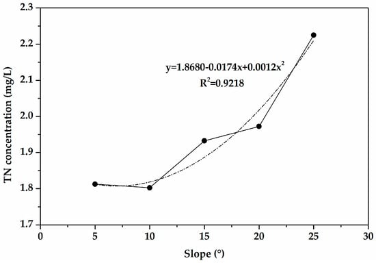 Figure 9 shows the correlation between slope and TN concentration, which can be expressed as a quadratic polynomial where the square of correlation coefficient (R2) is 0.9218. In Figure 9, four rainfall intensities on varying slope were averaged in order to eliminate the influence of rainfall intensity on TN concentration.