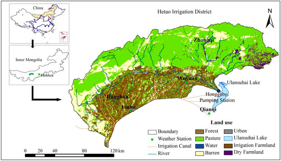 There are eight irrigation canals, with a total length of 181 km, and thirteen drainage channels across the irrigation district. Flood irrigation is the only irrigation method in this area. Water flows from the Yellow River into the farming area; the outlet is at the entrance of Ulansuhai Lake, which is downstream of the main drainage channel, as a drainage recipient from the farmland (Figure 1). The outflow from the lake returns to the Yellow River further downstream.