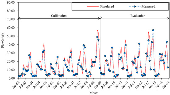 The monthly stream flow data for 2003 to 2013 as the observed data that were obtained from the Honggebo pumping station were selected for model calibration and evaluation. The data for the first 6 years, from 2003 to 2008, were used in the calibration phase and that for the remaining 5 years, from 2009 to 2013, were employed for the model evaluation. The results for the flow calibration and evaluation are shown in Figure 2. The statistical values obtained for NSE and R2 were 0.75 and 0.81, respectively, for the calibration period and 0.78 and 0.82, respectively, for the evaluation period (Table 2). Values of NSE < R2 are expected, because regression takes into account any linear relationship, even if the simulated values deviate from the 1:1 line of simulated versus observed values. Based on standards recommended in the literature [36], these results indicate that the model simulated runoff in the watershed satisfactorily (NSE > 0.5; |PBIAS| < 25%); the bias was particularly low (|PBIAS| < 2%) for streamflow.